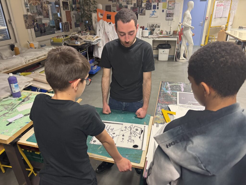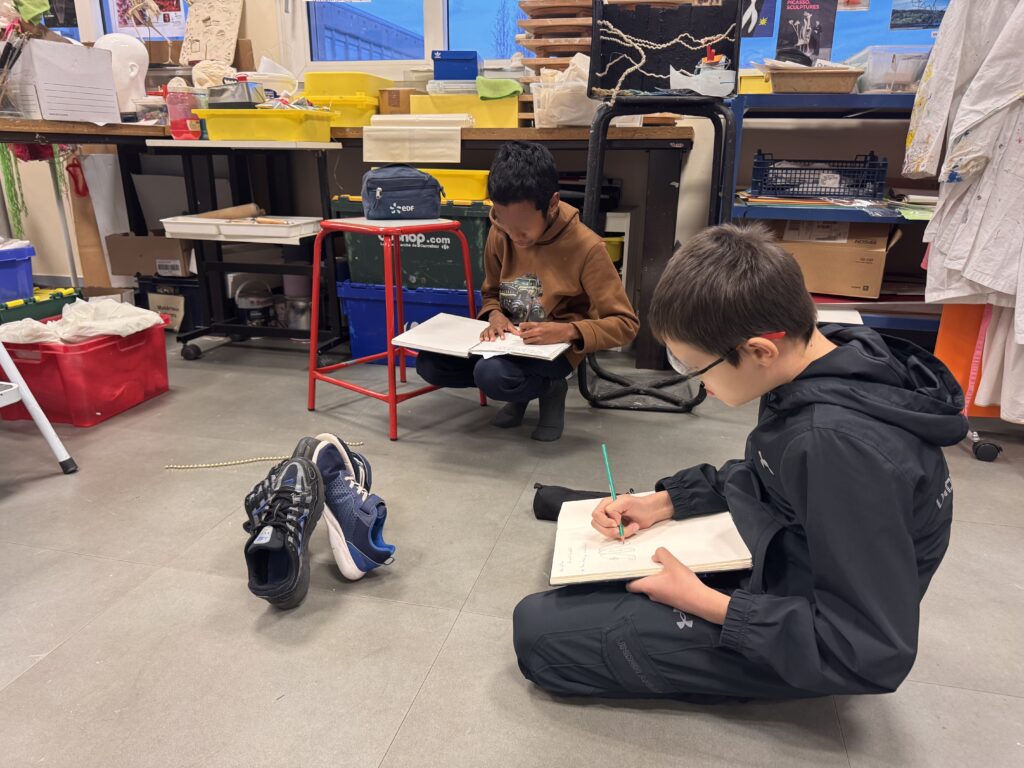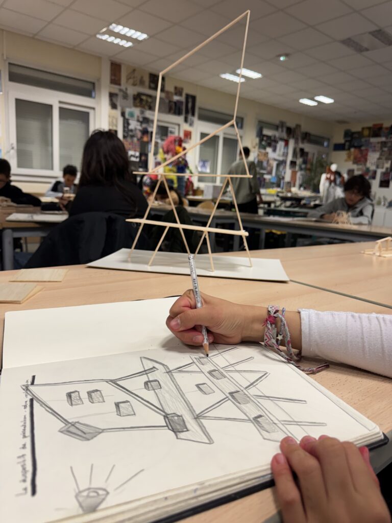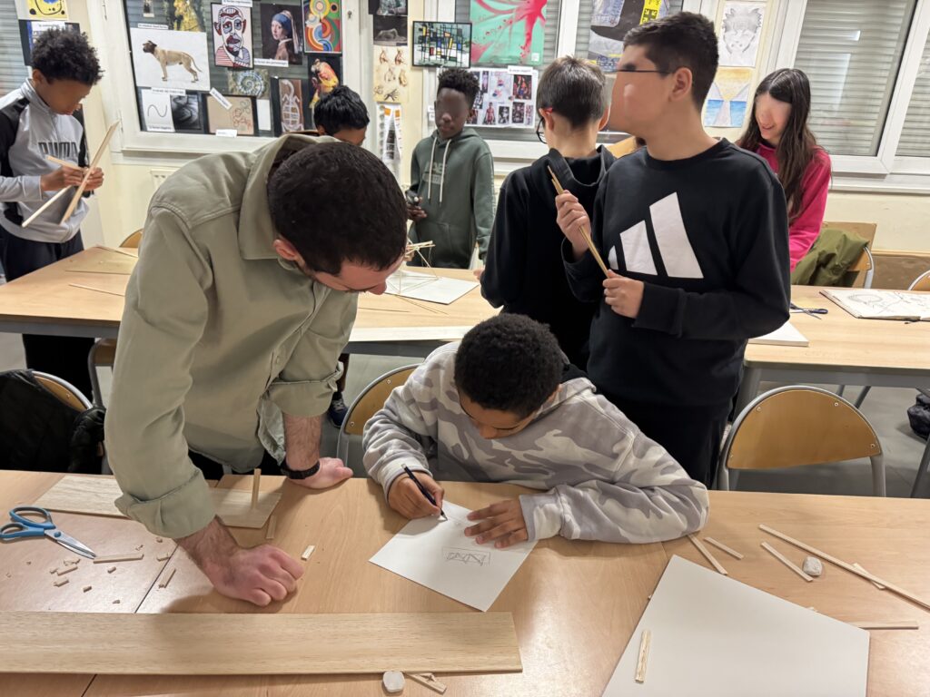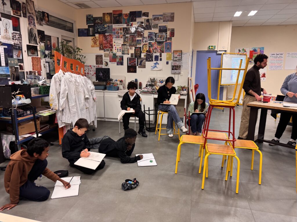 Le projet a débuté par une exploration sensible de l’espace. Les élèves ont appris à observer les jonctions entre les matériaux présents dans leur salle d’arts plastiques, en dessinant avec précision les points de rencontre entre le métal, le bois et le béton. Ces dessins, premières « empreintes visuelles », ont ouvert la voie à des expérimentations plus approfondies.