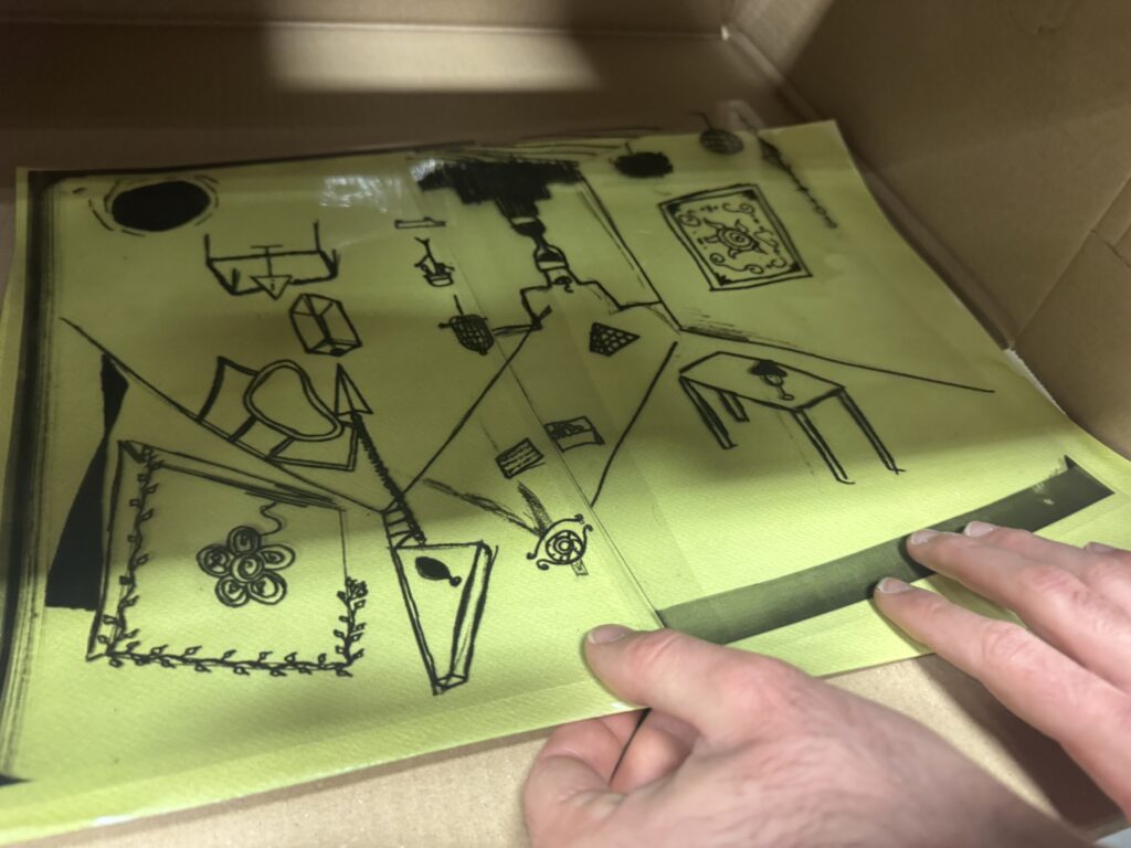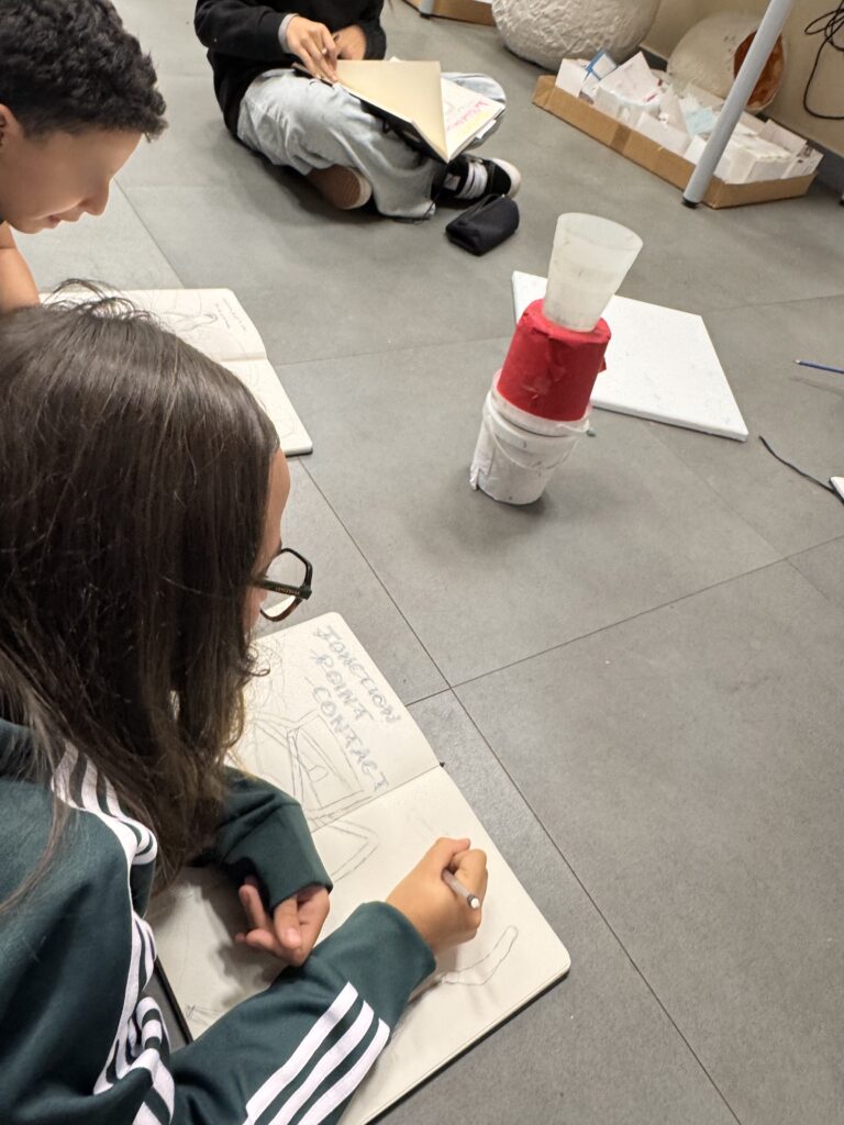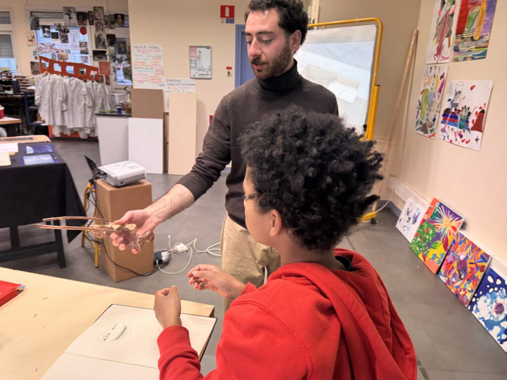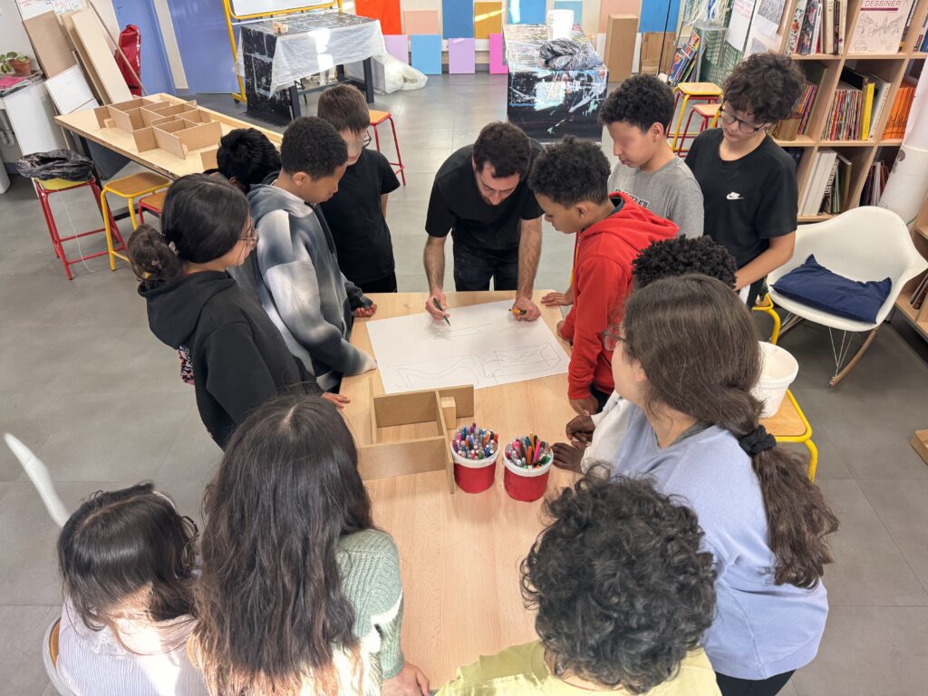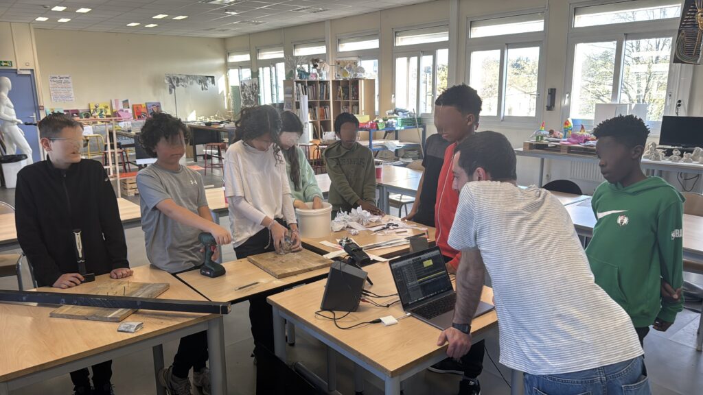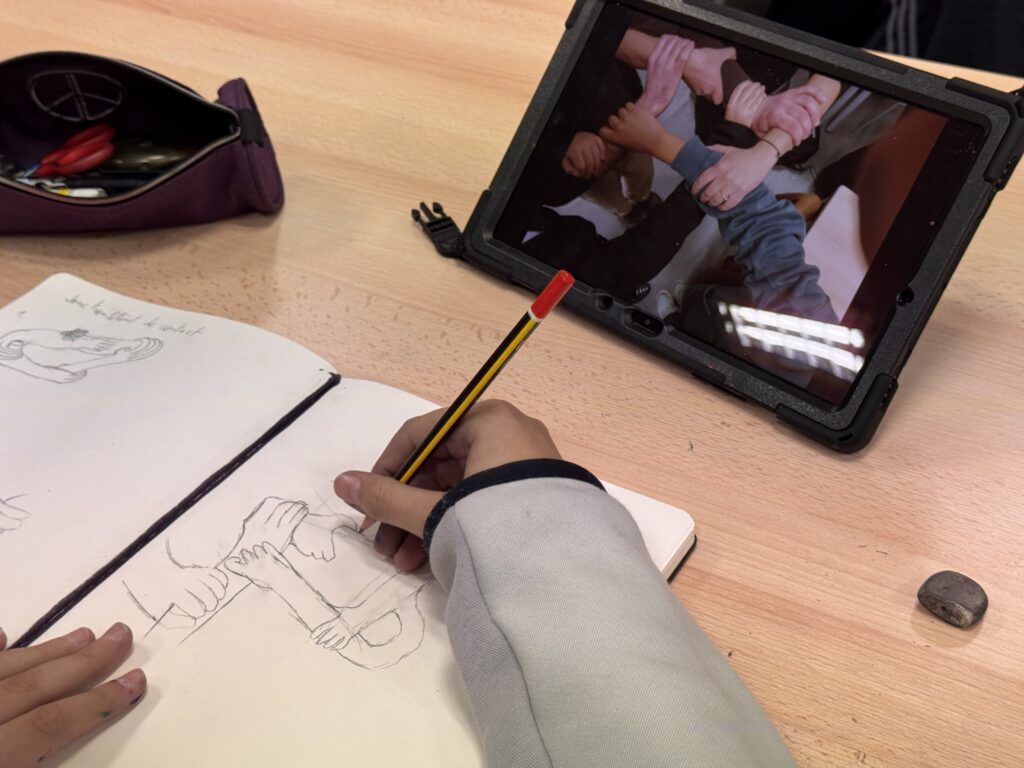 Le projet a débuté par une exploration sensible de l’espace. Les élèves ont appris à observer les jonctions entre les matériaux présents dans leur salle d’arts plastiques, en dessinant avec précision les points de rencontre entre le métal, le bois et le béton. Ces dessins, premières « empreintes visuelles », ont ouvert la voie à des expérimentations plus approfondies.