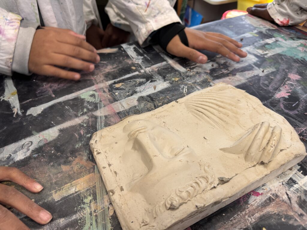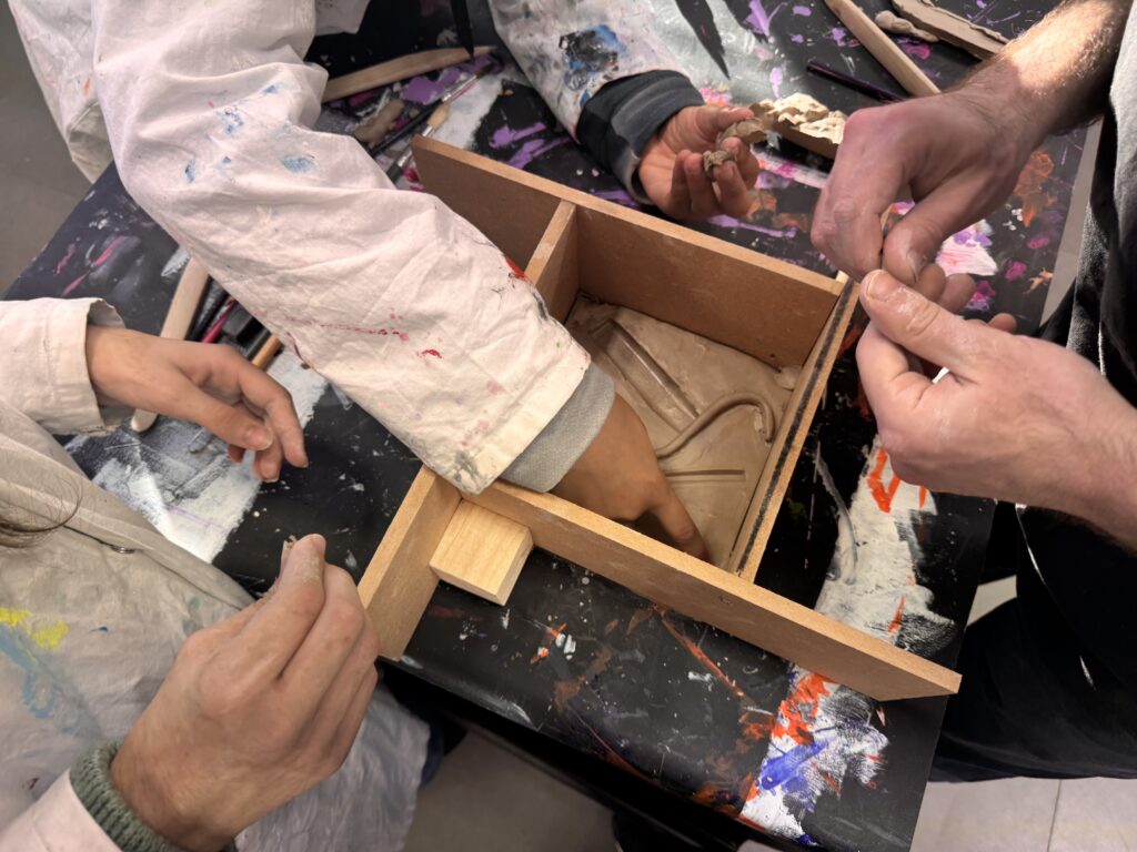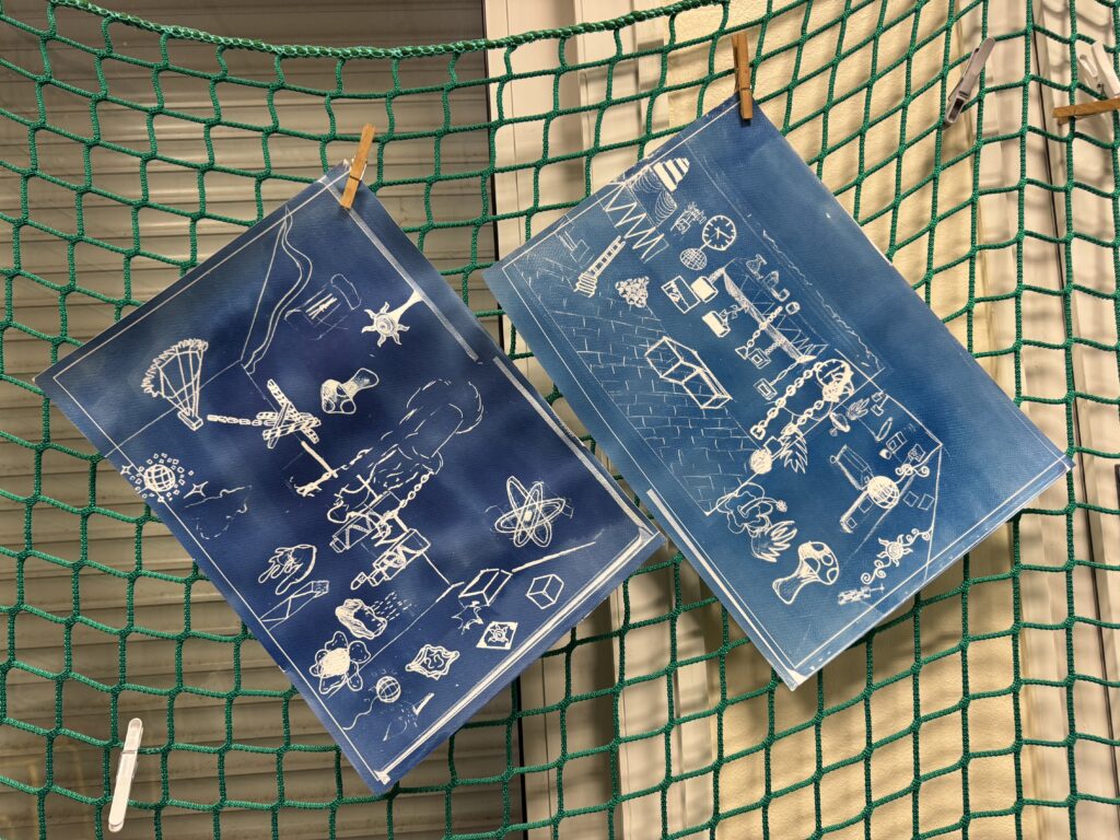 Guidés par Sirag Sesetyan, ils se sont ensuite confrontés à la matière : l’argile, malléable, pour capturer creux et reliefs, et le plâtre, qui se fige, pour conserver la mémoire des formes. Chaque élève a ainsi créé des empreintes physiques, jouant avec les notions de positif et de négatif, et découvrant comment le vide peut devenir aussi expressif que le volume. Parallèlement, ils ont expérimenté le cyanotype, réalisant des « empreintes lumineuses » de leurs compositions.