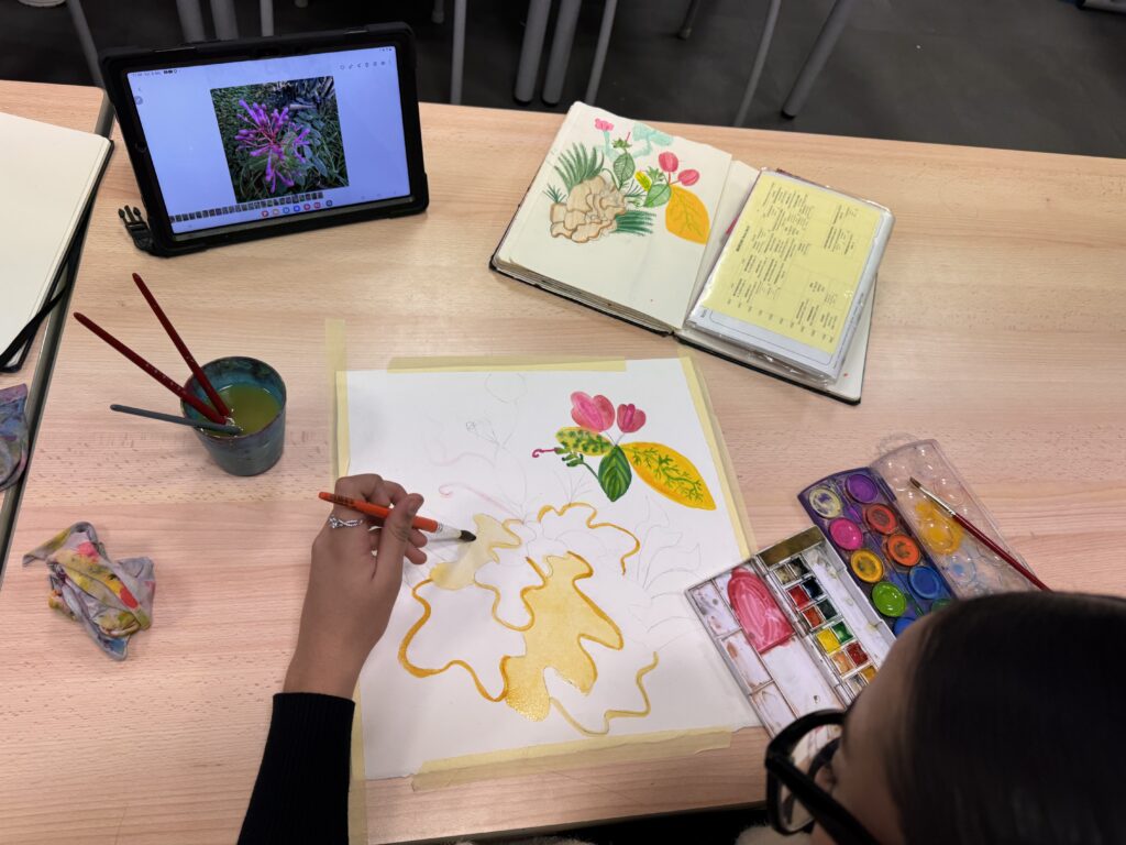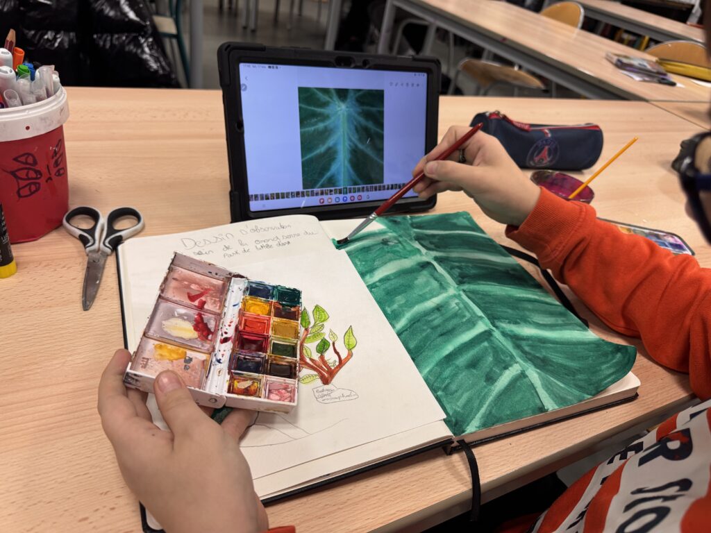 De retour en atelier, à partir des dessins réalisés et des prises de vue photographiques numériques, les élèves ont engagé une suite de recherches plastiques. Ils ont réinterprété les plantes observées en questionnant les écarts et les ressemblances, notamment à travers l’exploration de la matérialité de la peinture à l’aquarelle.